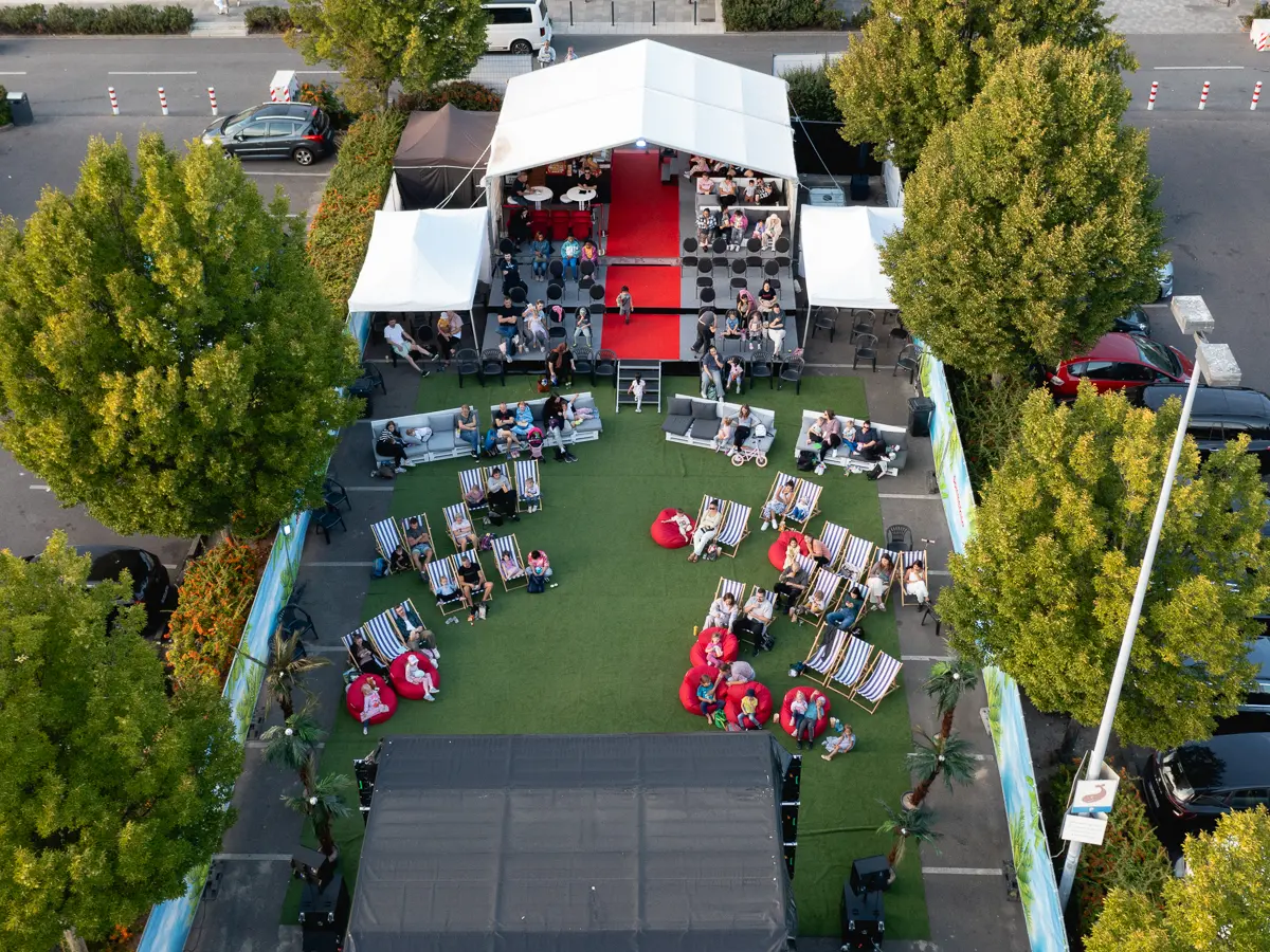 Ein Open Air Sommerkino ist ein temporäres Outdoor-Kino mit großer Bildfläche, Ton und Sitzplätzen. Mit LED Leinwand funktioniert das Bild auch dann, wenn es noch nicht komplett dunkel ist.
